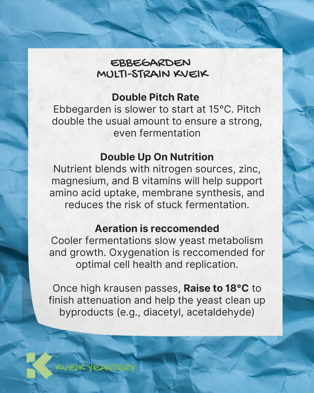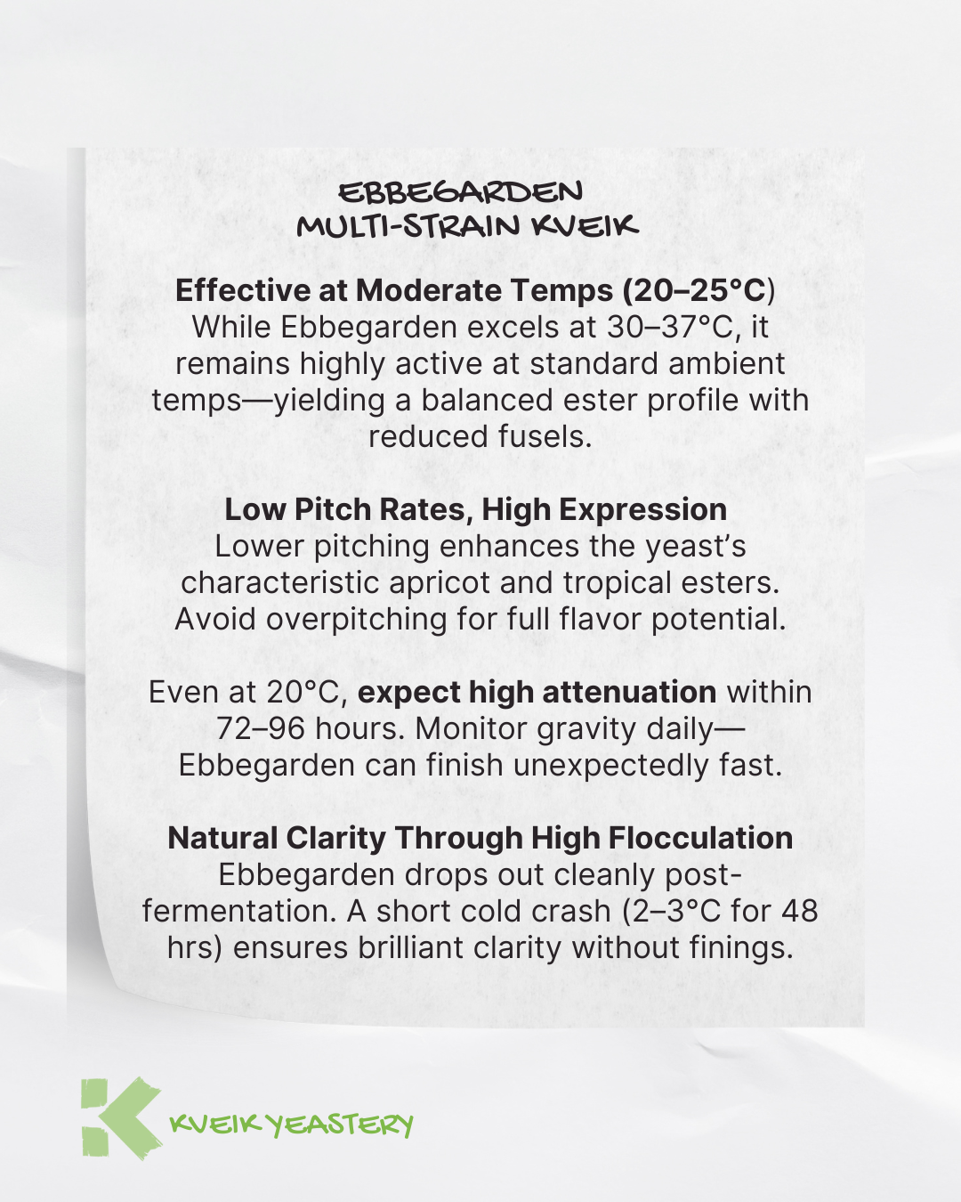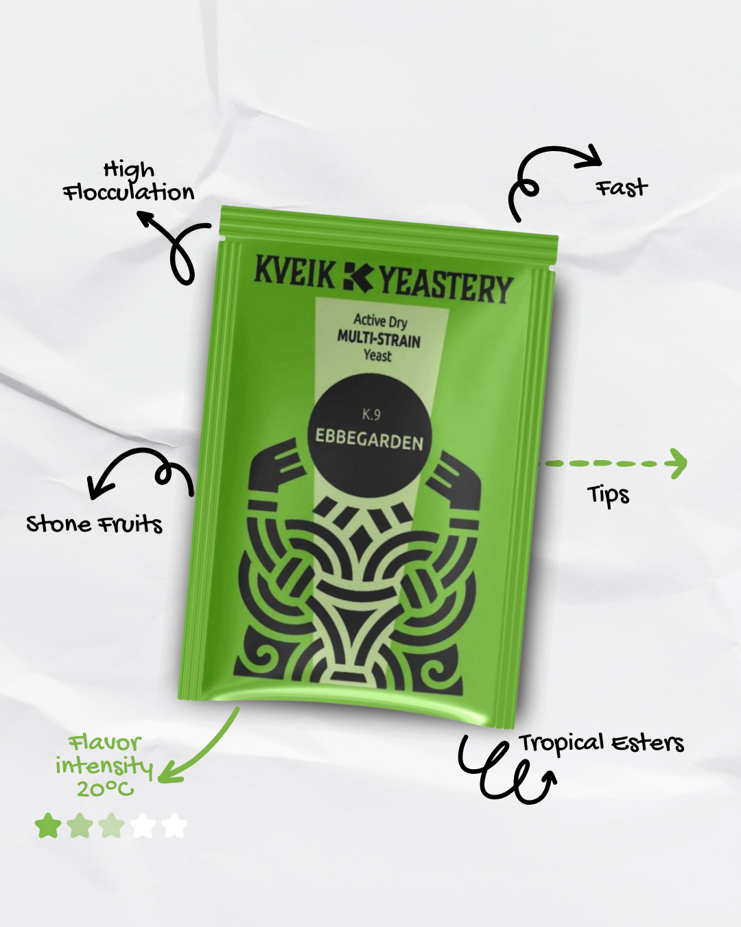 Ebbegarden multi-strain originates from Ebbegarden farm in Stordal. The flavour and aroma primarily come from apple and pear, with secondary notes of tropical fruit and citrus. Ebbegarden ferments well between 15–38°C and will ferment faster at higher temperatures. At an optimal temperature of 31–35°C, you can expect fermentation to take up to 72 hours. Ebbegarden is perfect for IPAs.